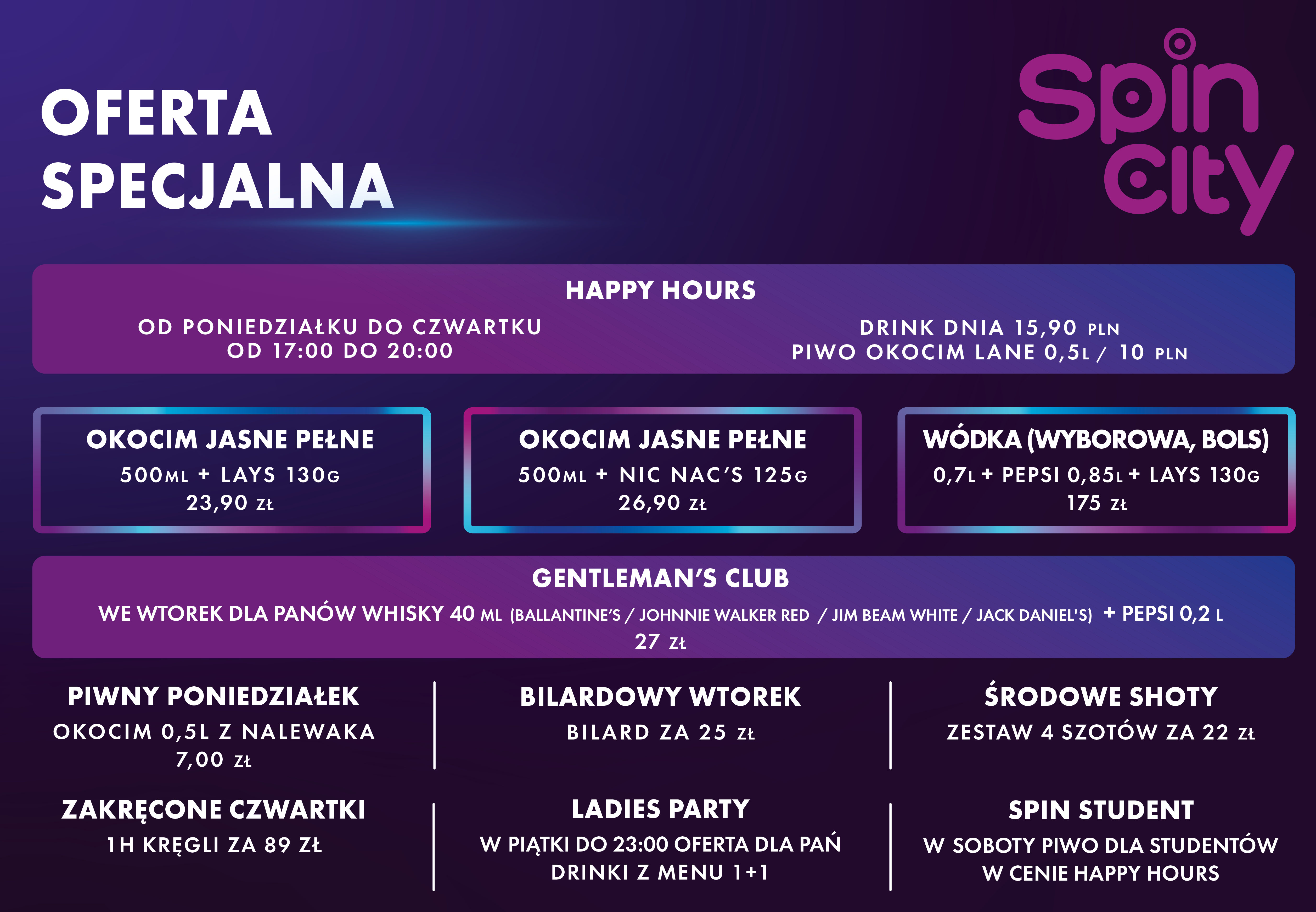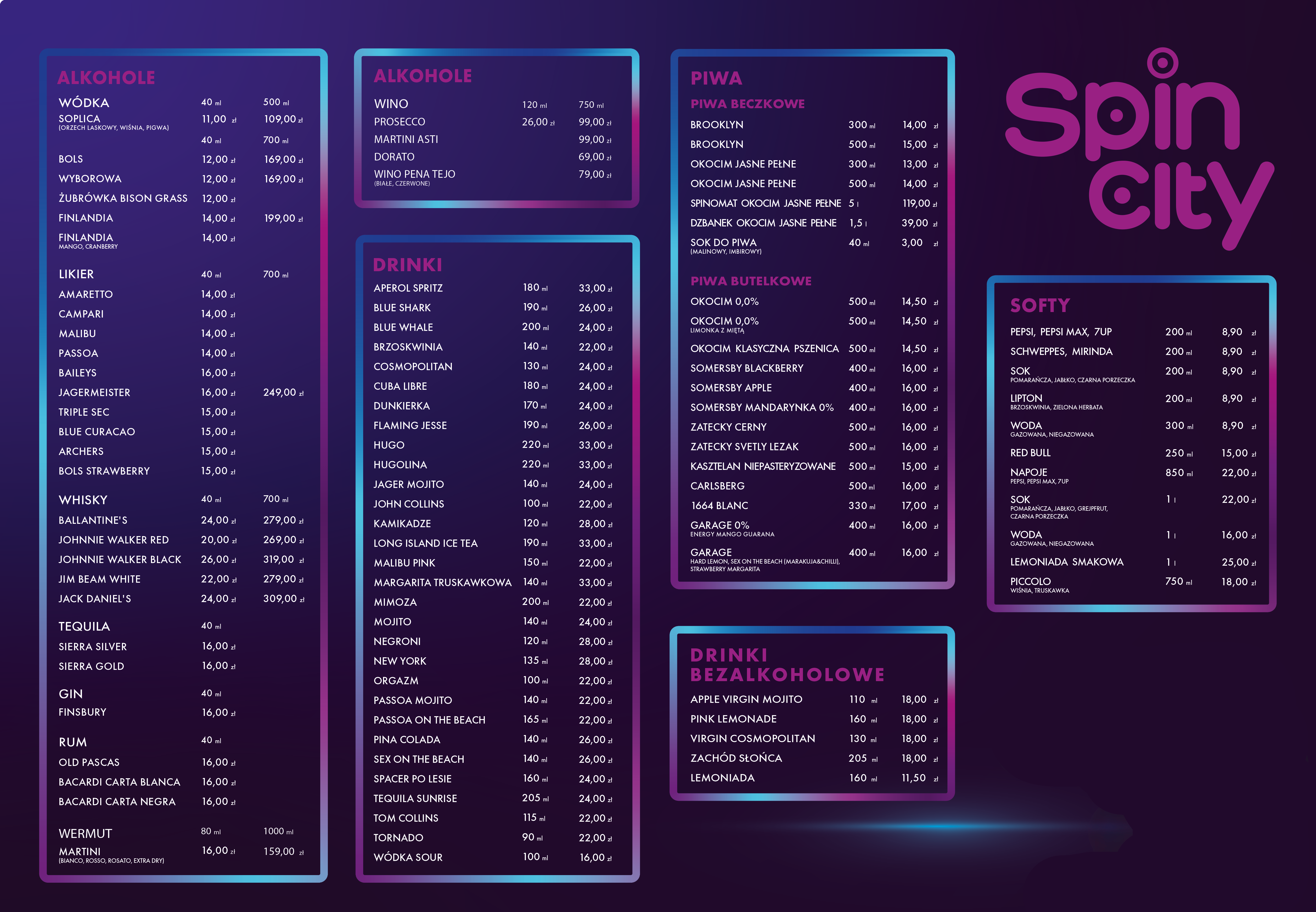 dostępne gigakoktajle: Cosmpolitan, Mojito, Tequila Sunrise, Blue Whale, Sex On The Beach, Kamikadze